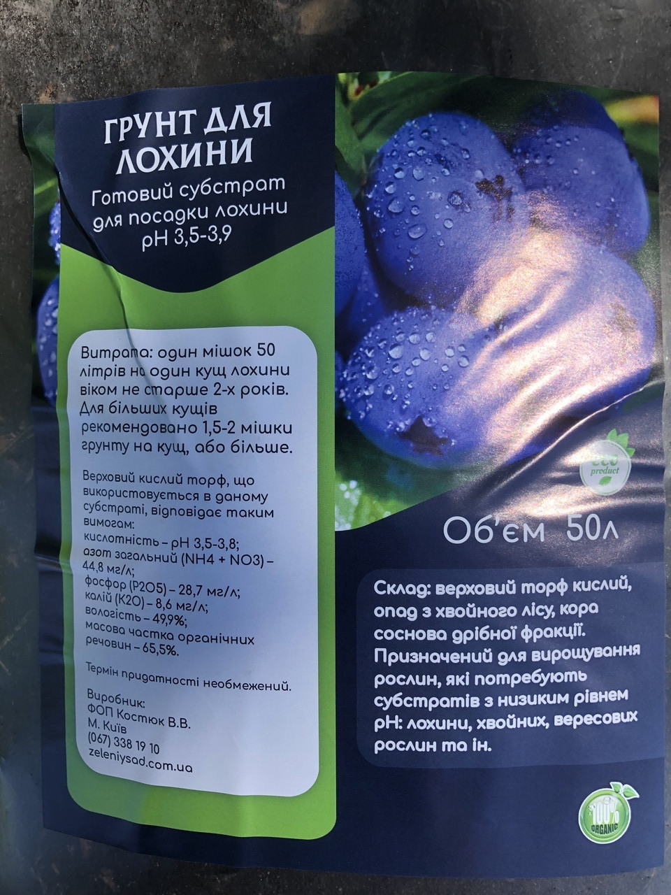 Верховий сфагновий торф має кислотність (pH) 3,5-4,5 одиниць – оптимальну для вирощування лохини, так як на ділянках з більш нейтральним грунтом (pH вище 5,5 одиниць), кущі садової лохини матимуть жовтий окрас листя і плодоносити не будуть.