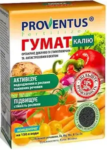 Гумат калію — органічне добриво, яке своїм впливом покращує смак плодів, збільшує їх розмір і прискорює дозрівання. 10 г гумату калію потрібно розвести у 2 л гарячої води, настояти 2 години, а потім вилити у 200-літрову бочку води. Цим добривом помідори поливають під корінь.