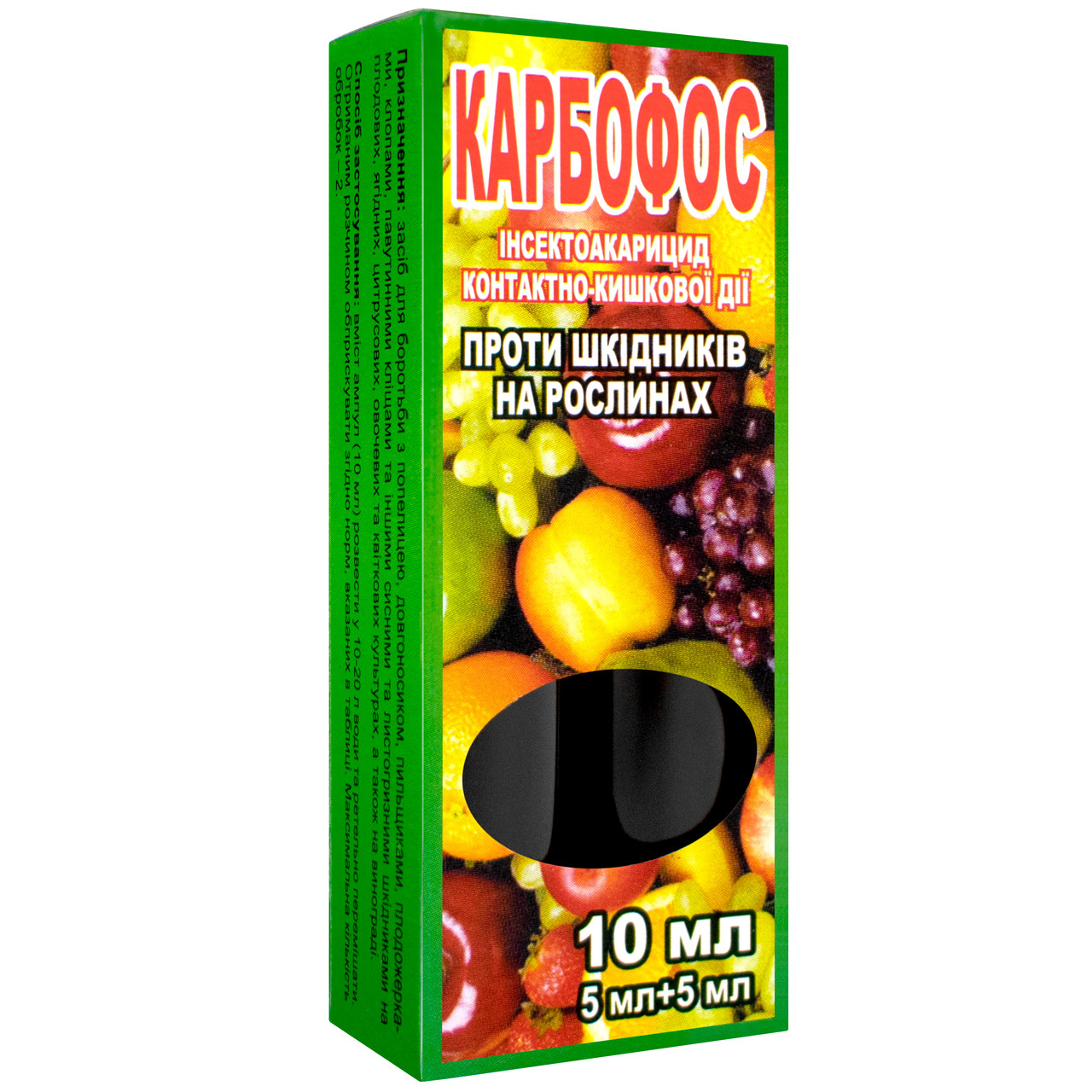 Карбофос – призначений для захисту таких культур: яблуня, груша, айва, вишня, слива, черешня, цитрусові, абрикос, персик, смородина, аґрус, малина, виноград, …