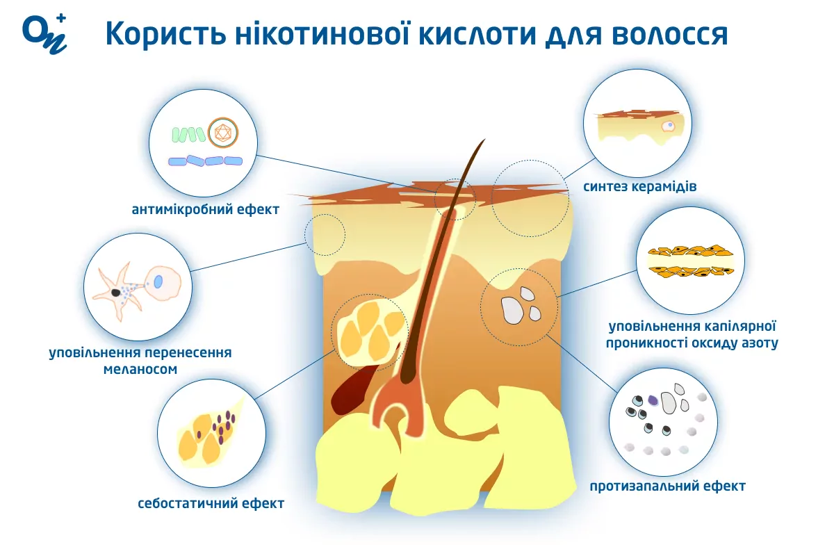 Переваги нікотинової кислоти в косметиці: Нікотинова кислота (вітамін PP, B3) здатна перетворити навіть найбільш проблемну шкіру. Вона активно вливається в процеси окислення і відновлення, що проходять в організмі, а також бере участь у зростанні тканин і перетворення жирових клітин в енергію.