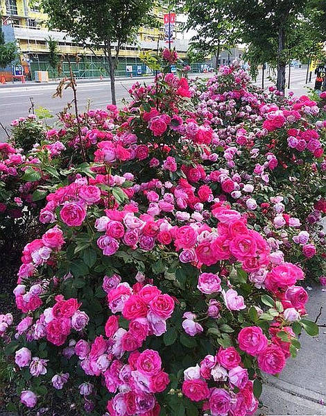 Medium pink double blooms in clusters of 1 to 4 blossoms cover this shrub with a large flush in June repeating through the summer. Very hardy.