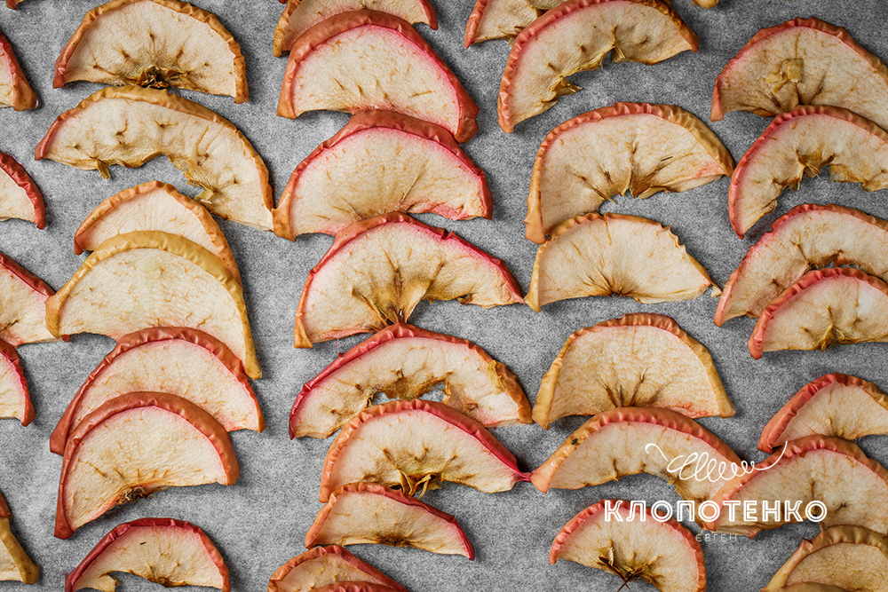 Просто наріжте яблука тоненькими колечками, розкладіть на сітку сушарки та сушіть протягом 8-10 годин при температурі 55-60 градусів Цельсія.