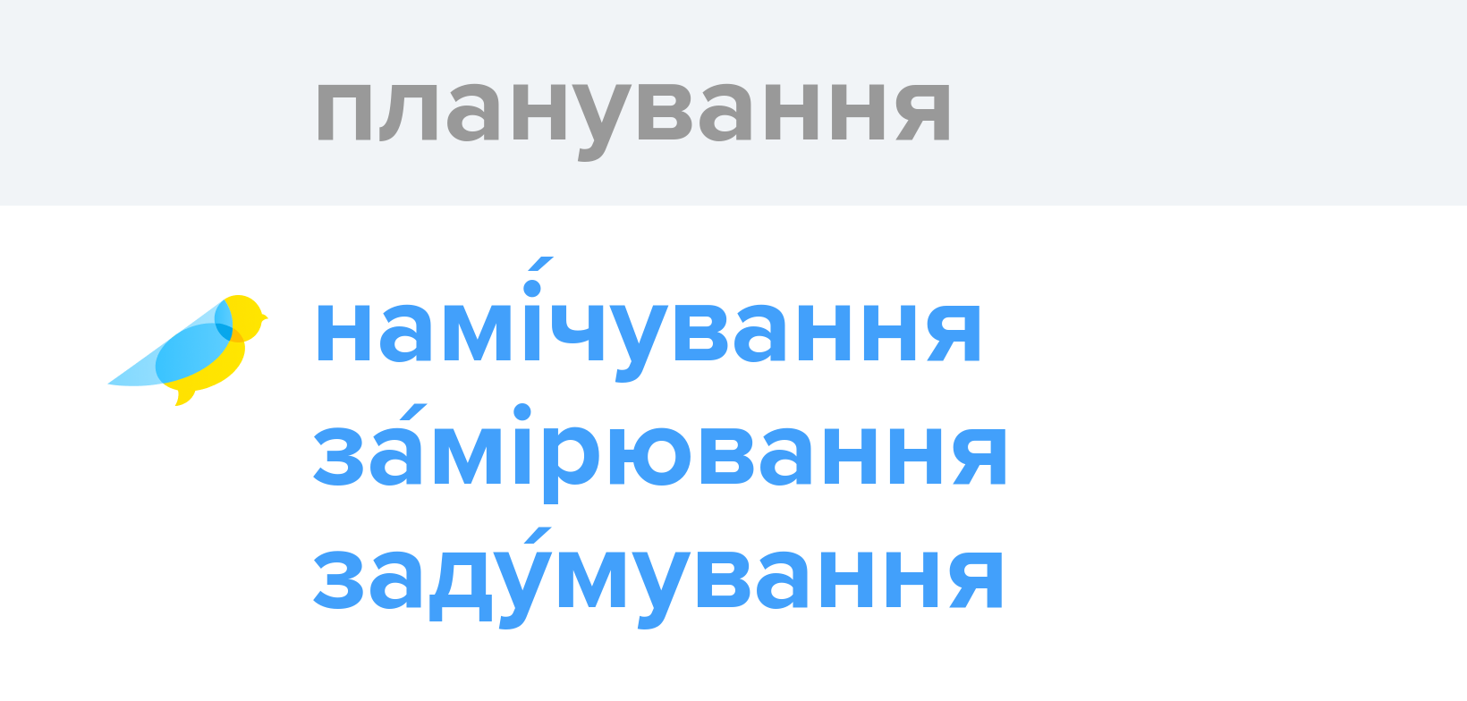 Планування — процес складання плану або проекту (будівлі, споруди і т. ін.). Найкращий переклад — Намі́чування (9 голосів). Приклад вживання — розпочинаємо …