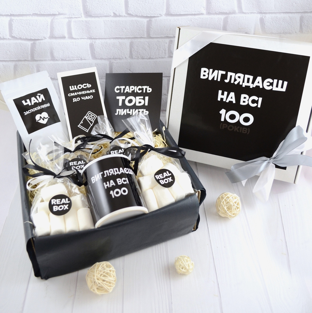 кава в зернах, мармелад або джем, Рафаелло, сироп для напоїв і маршмеллоу; чай, шоколад, зернова кава і чекова книжка "для нього"; стакан для віскі, камені для віскі, міні-батончик Lion; три баночки варення, джему або мармеладу на вибір, два келихи для віскі, печиво з шоколадом, камені для віскі.