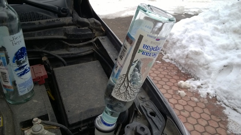 Долить спирт или концентрат Растопить незамерзайку, превратившуюся в одну большую ледышку или снежную кашу, поможет обычный спирт. Сгодится самая дешевая бутылка водки из ближайшего магазина. Водку (или любой концентрат зимней жидкости для стеклоочистителя) нужно долить в бачок и подождать пока лед расплавится.