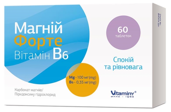 Склад 1 таблетка містить: основні речовини: магнію (у вигляді карбонату магнію) – 100,0 мг (mg), вітаміну В6 (у вигляді піридоксину гідрохлориду) – 0,35 мг (mg …