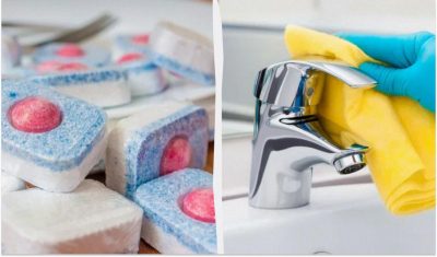 Вам потрібно відламати частину таблетки, покласти її в чашку, налити гарячу воду і повністю розчинити. Залишити в такому вигляді на годину, а потім промити чашку під проточною водою. Таблетки для посудомийної машини для прибирання будинку прекрасно впораються, якщо необхідно вичистити до білого кольору брудну раковину.