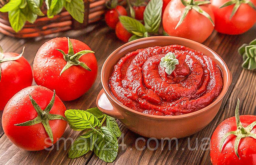 Томатна паста являє собою універсальну приправу, яка широко використовується в приготуванні безлічі страв. До її складу входять виключно натуральні та стиглі українські помідори ( у складі 25% сухих речовин).