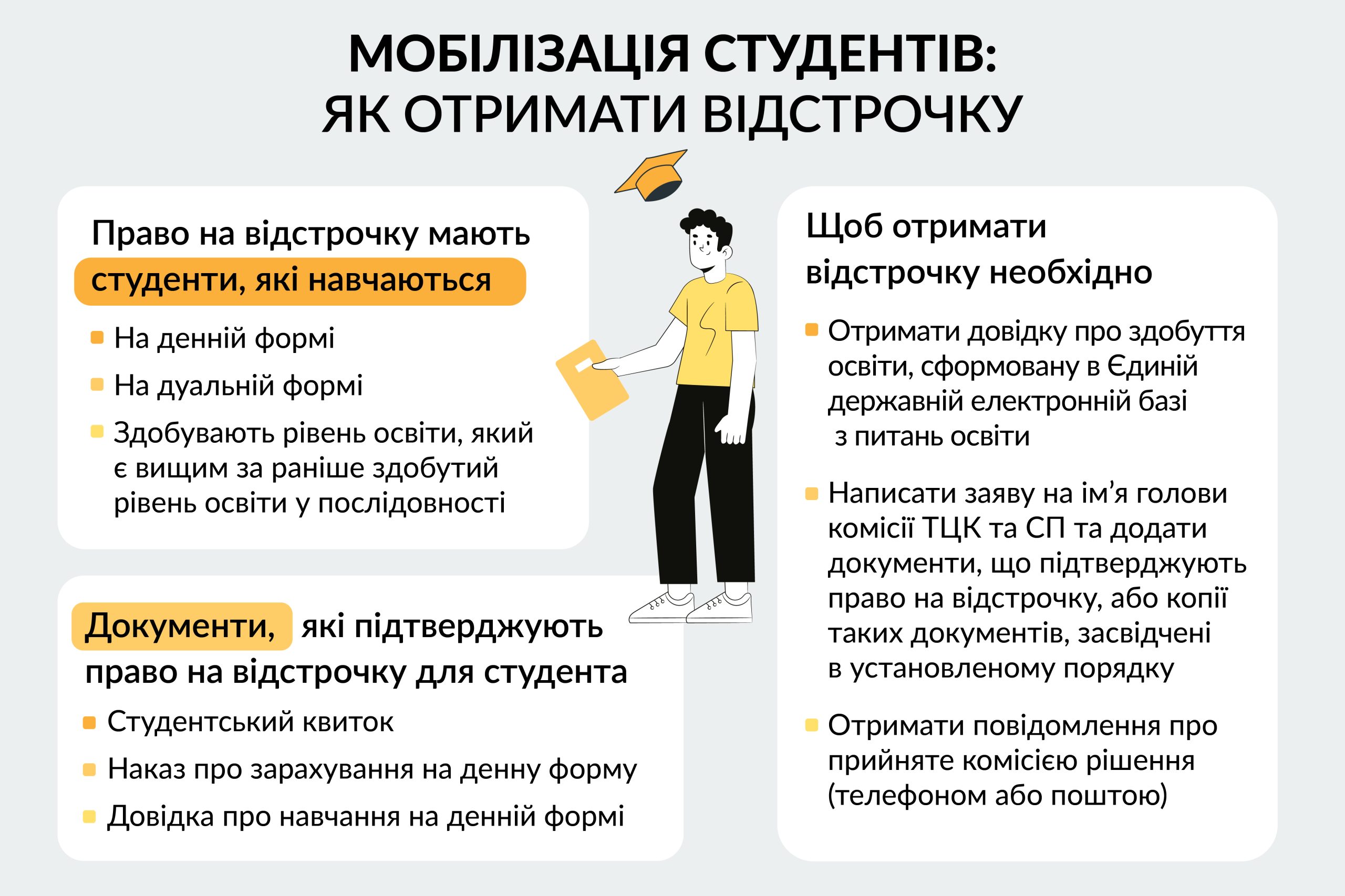 Відповідно до законодавства України, відстрочка надається студентам, які: Навчаються на денній формі у закладах вищої освіти (ЗВО) або професійно-технічних училищах. Отримують першу або наступну за рівнем ступінь освіти (бакалавр, магістр, доктор).