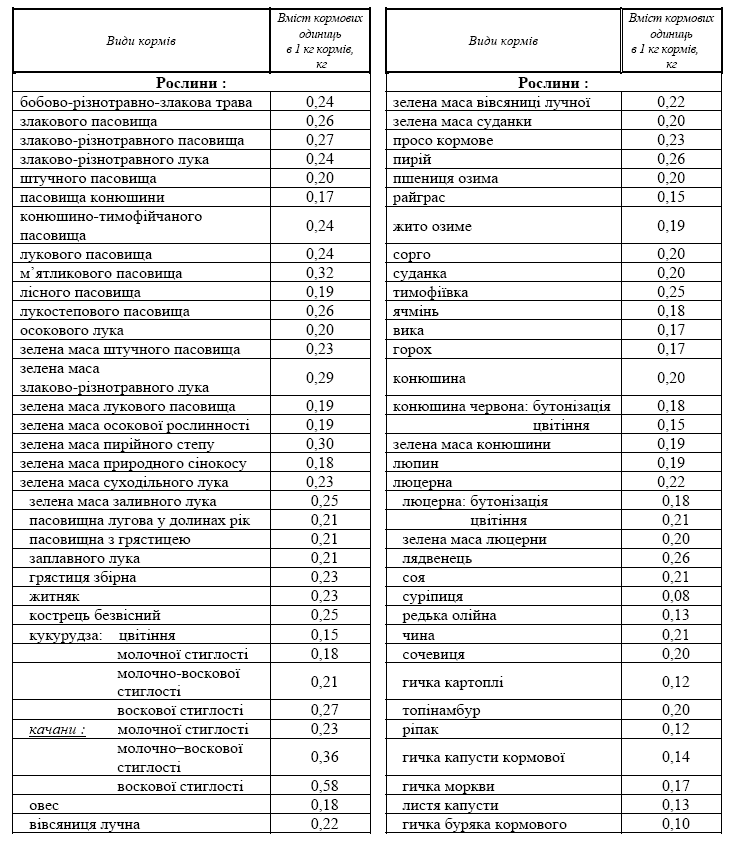 Середню нормативну поживність кормів за видами у кормових одиницях наведено у Додатку 3. Витрати кормів розраховуються окремо за кожною групою та видом худоби …