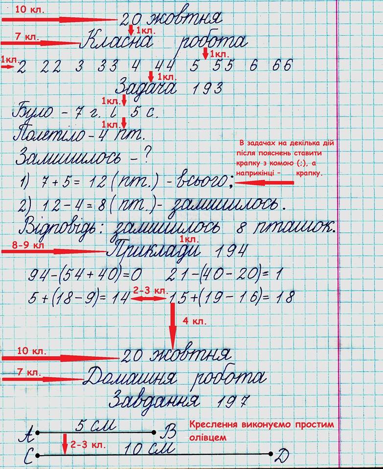 початком наступної (домашня робота) в зошитах з математики слід пропускати чотири клітинки. Цифри і літери писати у клітинці зошита похило.