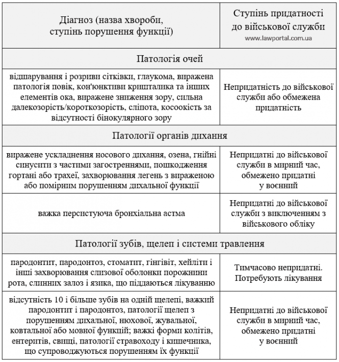 Який перелік хвороб, непридатних до військової служби?