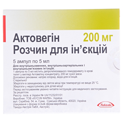 АКТОВЕГІН Ішемічний інсульт, залишкові явища геморагічного інсульту, черепно-мозкові травми, енцефалопатії різного генезу; опіки I-III ступені.