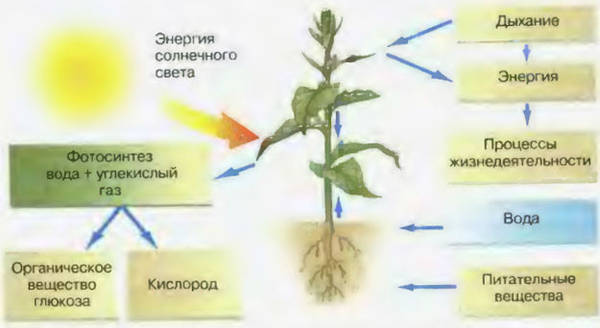 Для цього рослинам потрібні вода та поживні речовини (всмоктуються коренем), вуглекислий газ (є в повітрі) і світло (сонячне або штучне). Під дією світла рослини перетворюють воду і вуглекислий газ на глюкозу (цукор), а в повітря виділяють кисень. Це явище називається фотосинтезом.