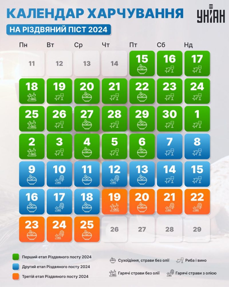 Нагадаємо, що 1 вересня 2023 року ПЦУ та УГКЦ перейшли на новоюліанський календар, а тому дата більшості церковних свят (крім перехідних) змінилася. Різдво ми святкуємо 25 грудня, а це означає, що Різдвяний піст 2024 року триватиме від 15 листопада до 24 грудня.